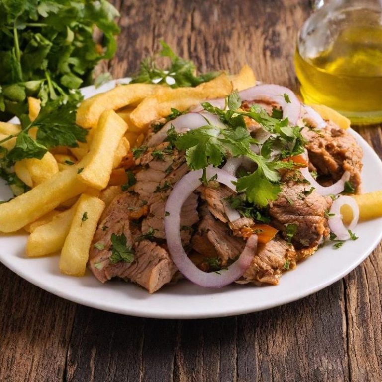 Pfannengyros mit Pommes, Tzaziki und Krautsalat